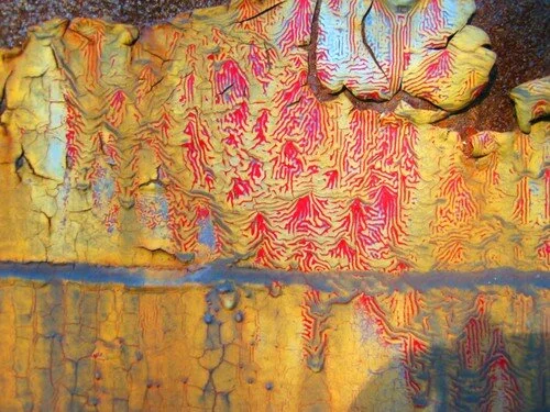 Seven Stories is a series of abstract photographs taken in Bardstown, Kentucky while I was visiting Gethsemani Abbey. During a hike outside the monastery grounds, I came upon some abandoned train cars that had, at some time, burned and then rusted over many years. The decaying metal and paint were visually stunning.