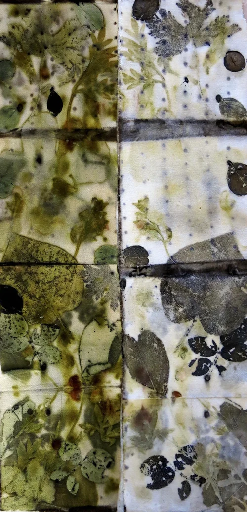 Botanical contact prints, organic indigo, and ferrous sulfate on cotton and linen.