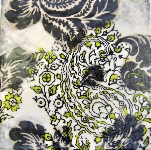 Printed & painted paper, vintage sari fabric, and encaustic medium.